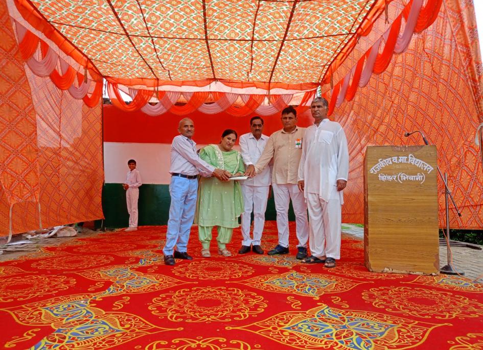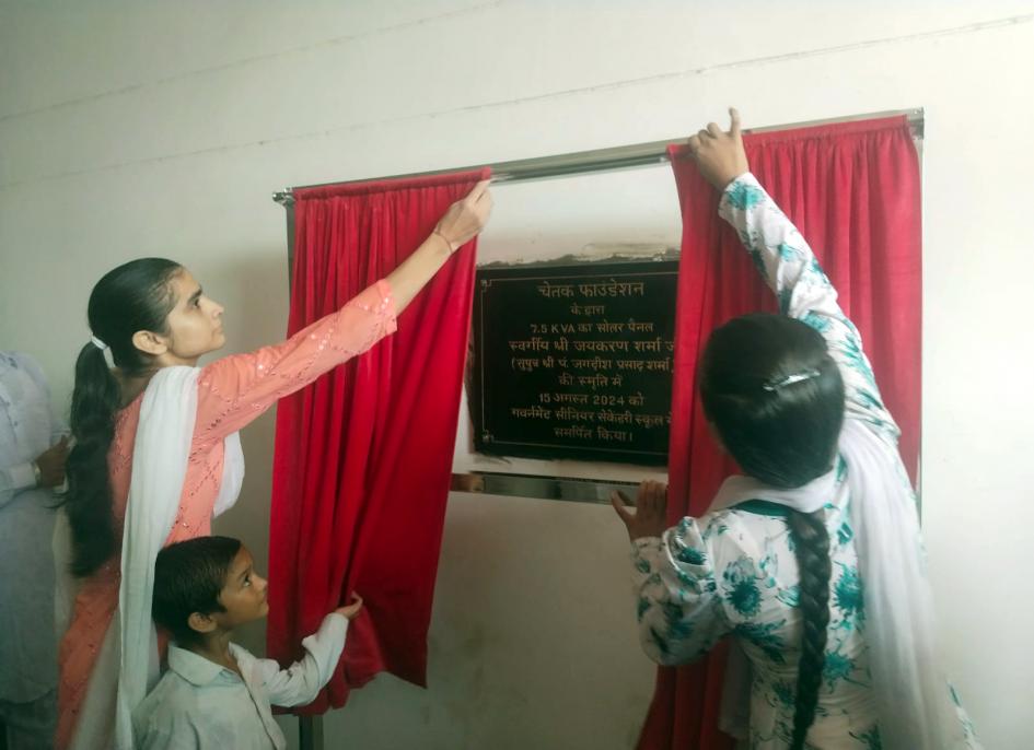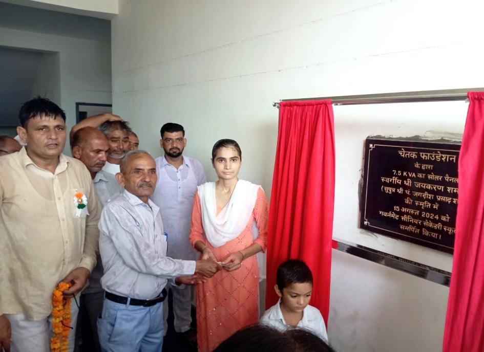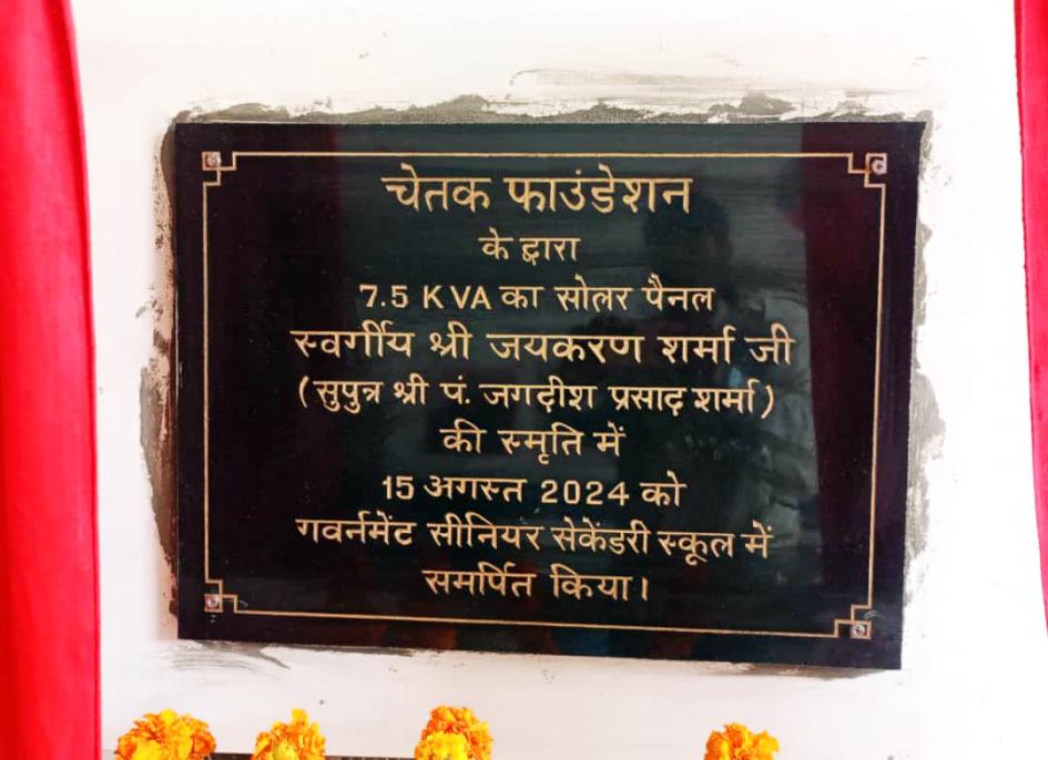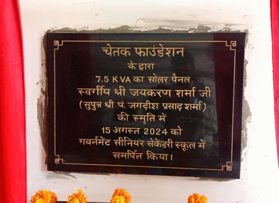 चेतक फाउंडेशन के द्वारा 7.5 KVA का सोलर पैनल स्वर्गीय श्री जयकरण शर्मा जी (सुपुत्र श्री जगदीश प्रसाद शर्मा) की स्मृति में 15 अगस्त 2024 को गवर्नमेंट सीनियर सेकेंडरी स्कूल में समर्पित किया।