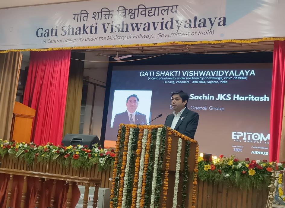 Sachin JKS haritasH, Director of Chetak Group has been invited by Gati Shakti Vishwavidyalaya at their Annual Tech Fest “EPITOME-23” where he has delivered a keynote speech and shared his thoughts and views about the STT (Sustainable Transportation Technology) and how Chetak Group has started by his father Late Shri Jai Karan Sharma. He also told the students about the logistics and his major areas like first and last mile and warehousing etc. and how many projects currently started by Chetak Logistics like Green deliveries (convert old internal combustion engine vehicles to CNG fuel-based vehicles) , Project Green (use solar power and operate all electric equipments) and smart warehousing (design warehouse layout to minimize material and manpower movement by using vertical space). Shared some examples also related to life changing decisions (A plan on which he already worked for past 2 years) which he has discussed with his father. How he has started “MAVYN” the first digital logistics company where there will be no manpower required on field and no other requirements they required and how media give the name “Uber of Trucks”.